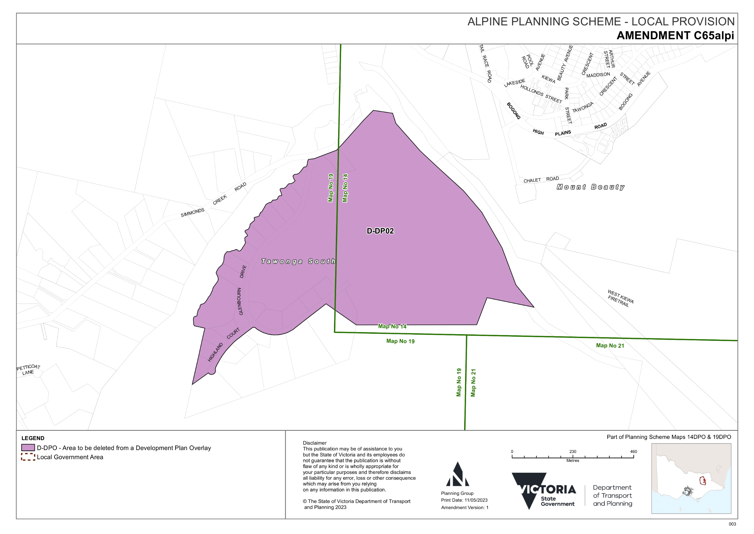Amendment C65alpi proposes to remove Development Plan Overlay (Schedule 2) from the area around Glenbourn Drive, Tawonga South, as the schedule contains no content.