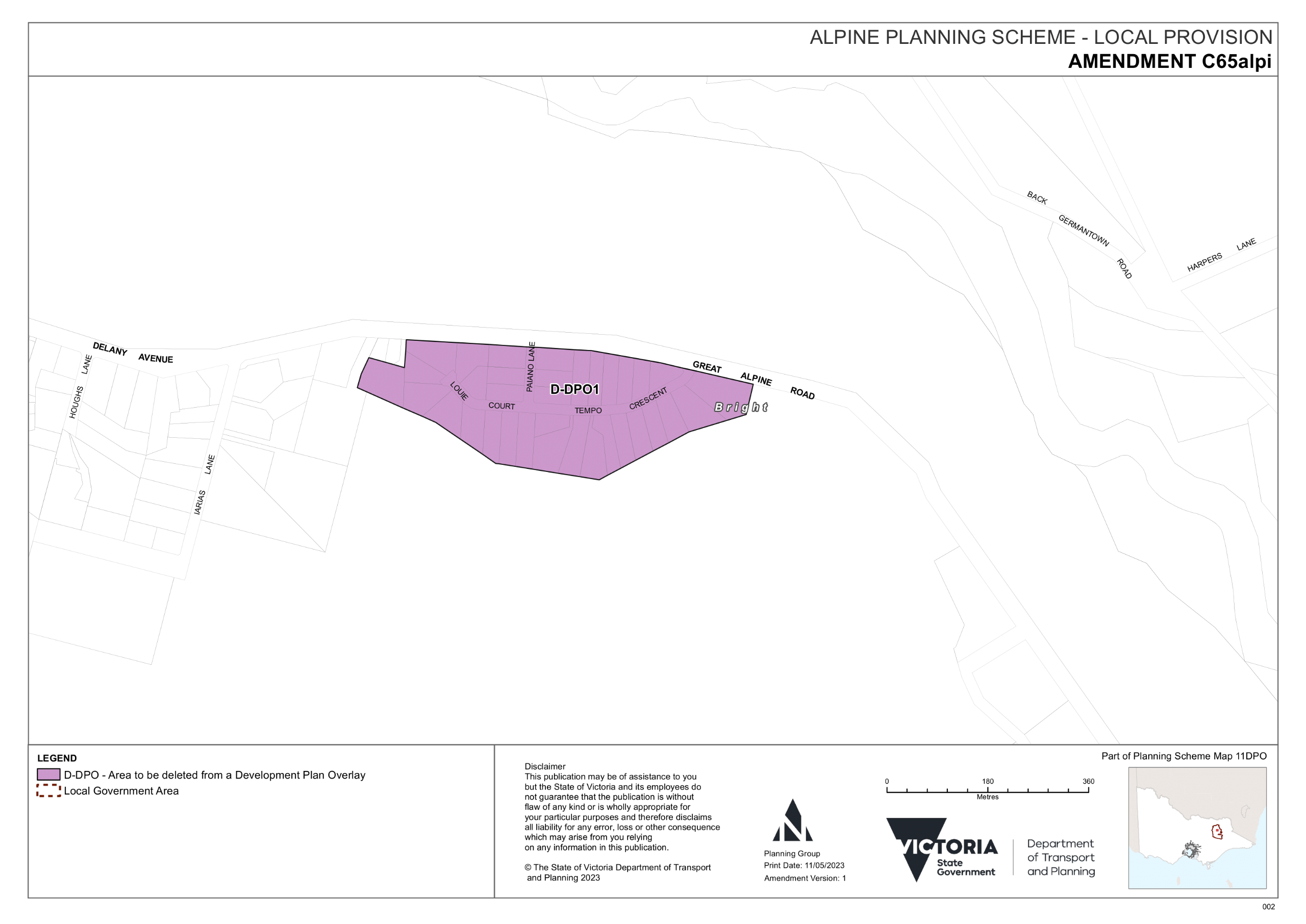 Amendment C65alpi proposes to remove Development Plan Overlay (Schedule 1) from the area around Tempo Court, Bright, as the schedule contains no content.