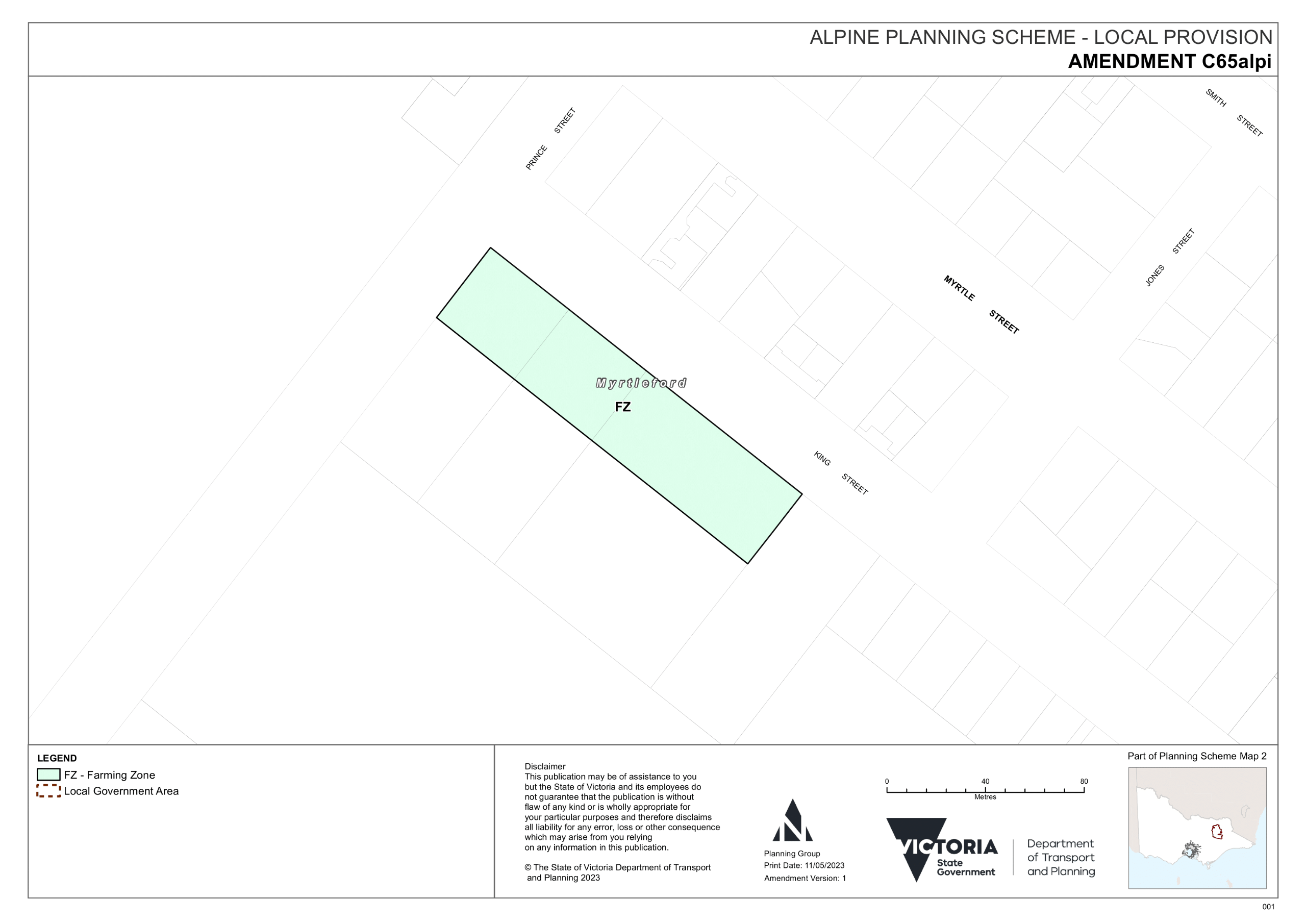 Amendment C65alpi proposes to rezone the northern part of the properties at 27, 33, and 35 King Street, Myrtleford from General Residential Zone (Schedule 1) to Farming Zone so that each land parcel is no longer in two zones.