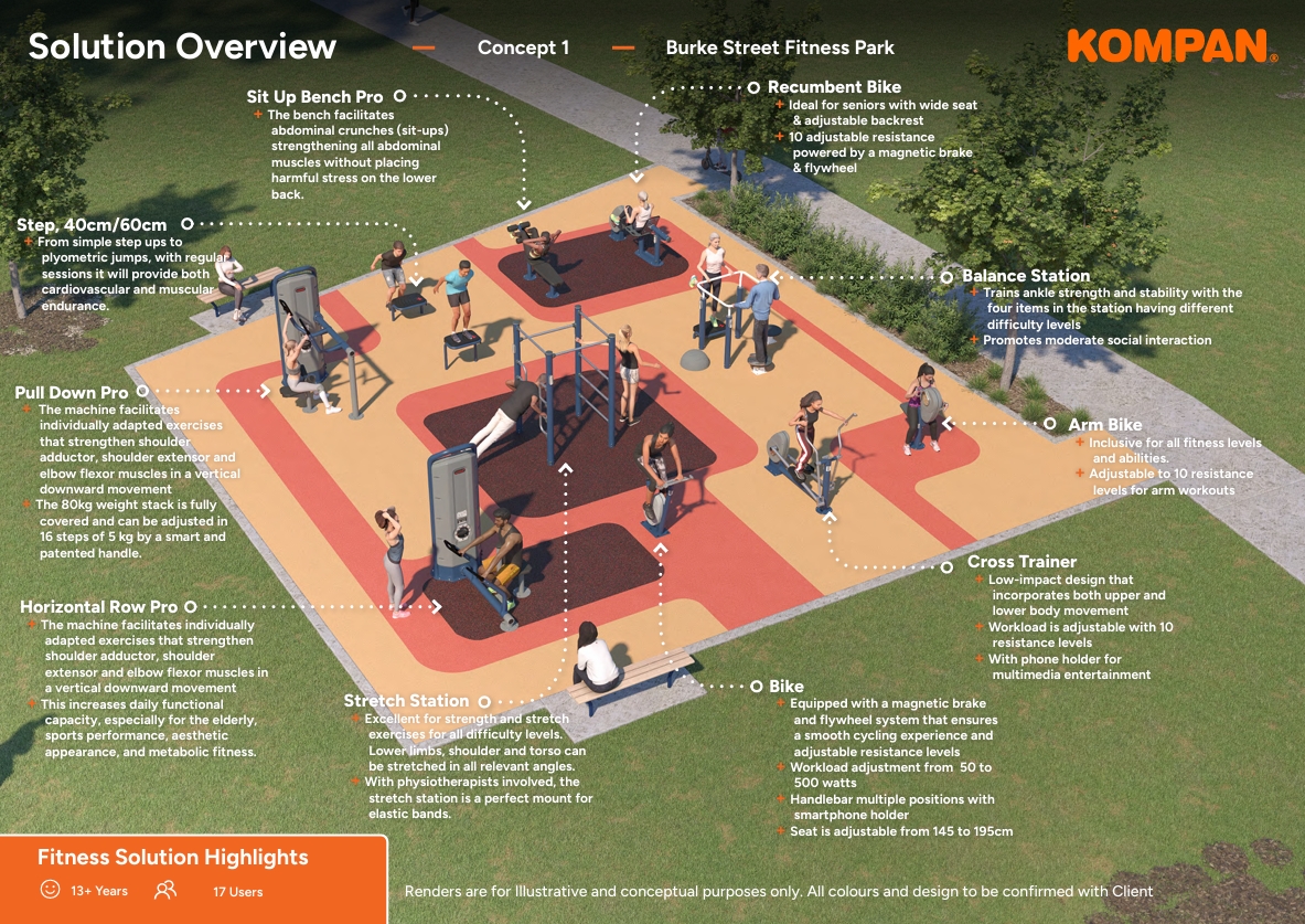 The equipment will be supplied by Kompan Pty Ltd, a leading provider of outdoor fitness and play solutions.