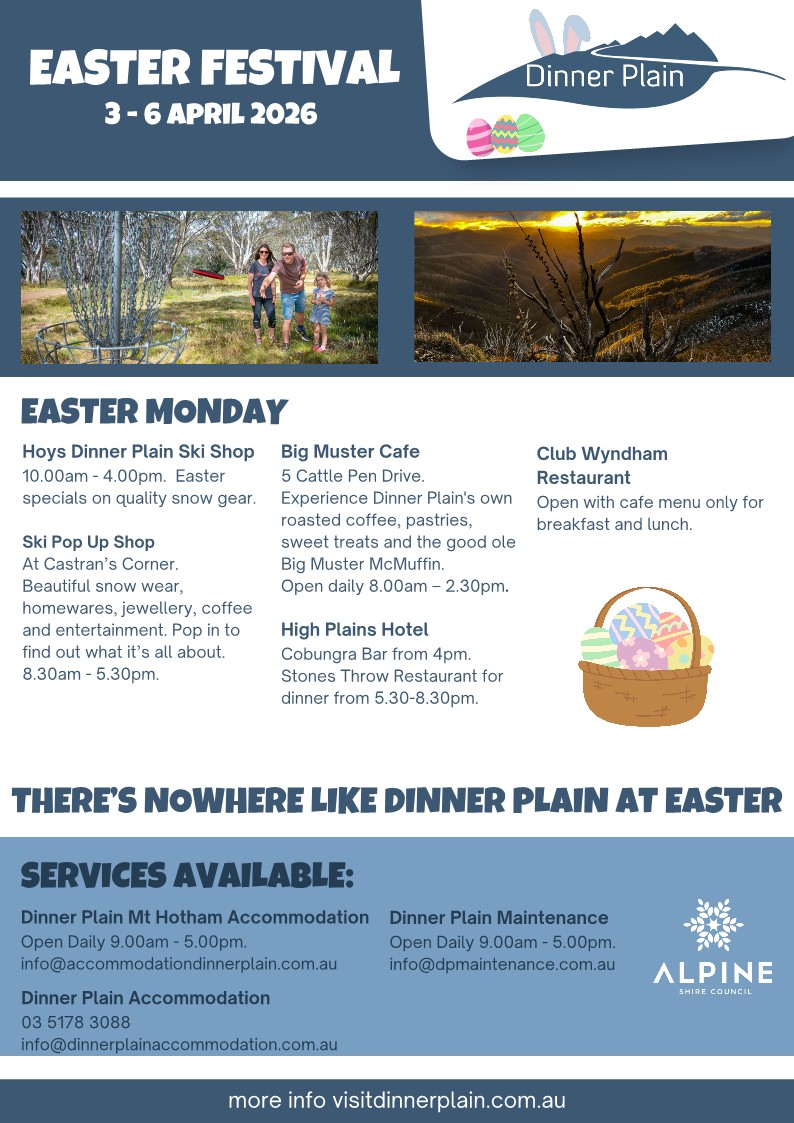 Whether you’re popping up for the day or staying the whole long weekend, Dinner Plain is a great spot for Easter adventures, family fun or simply soaking up the scenery.