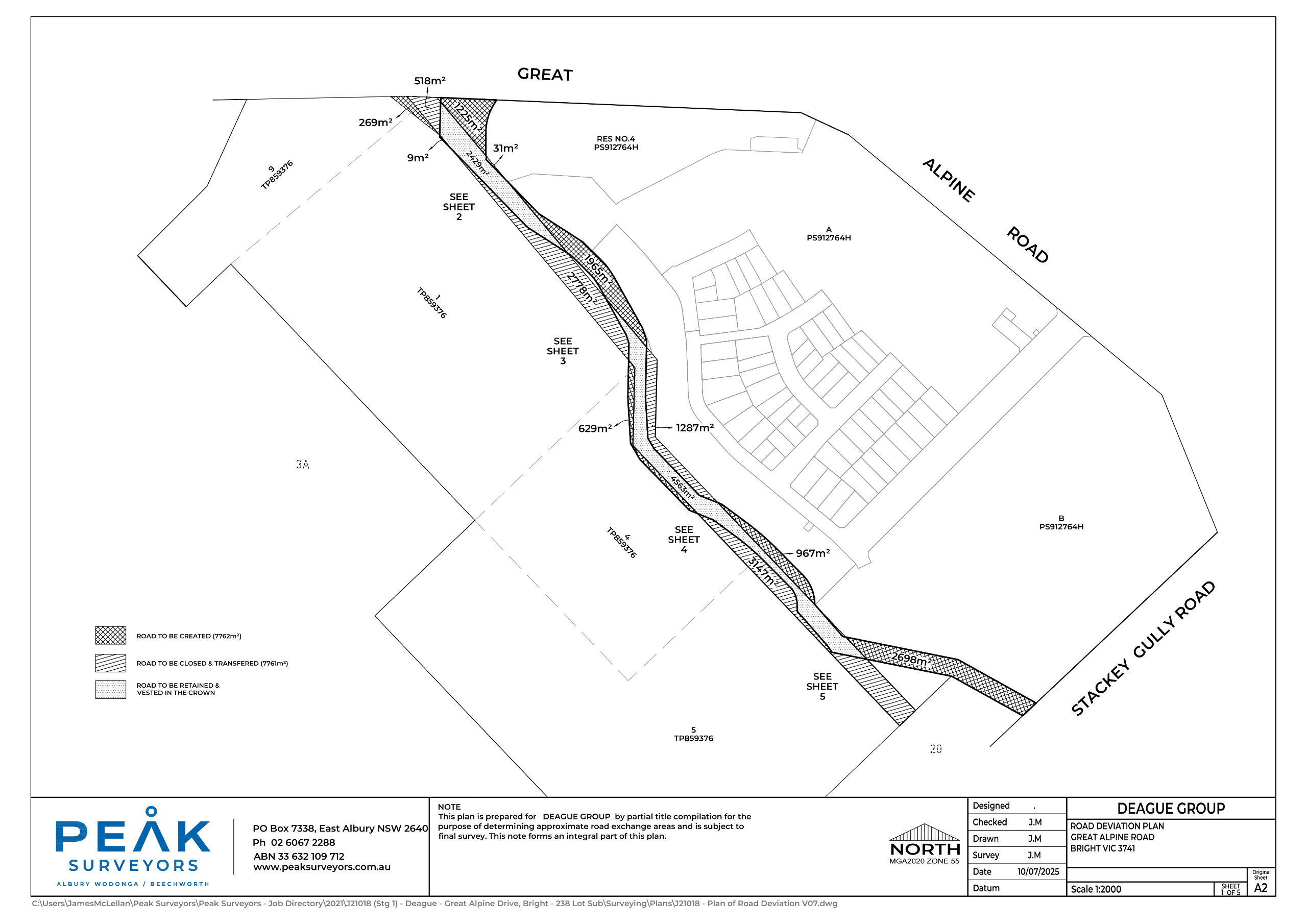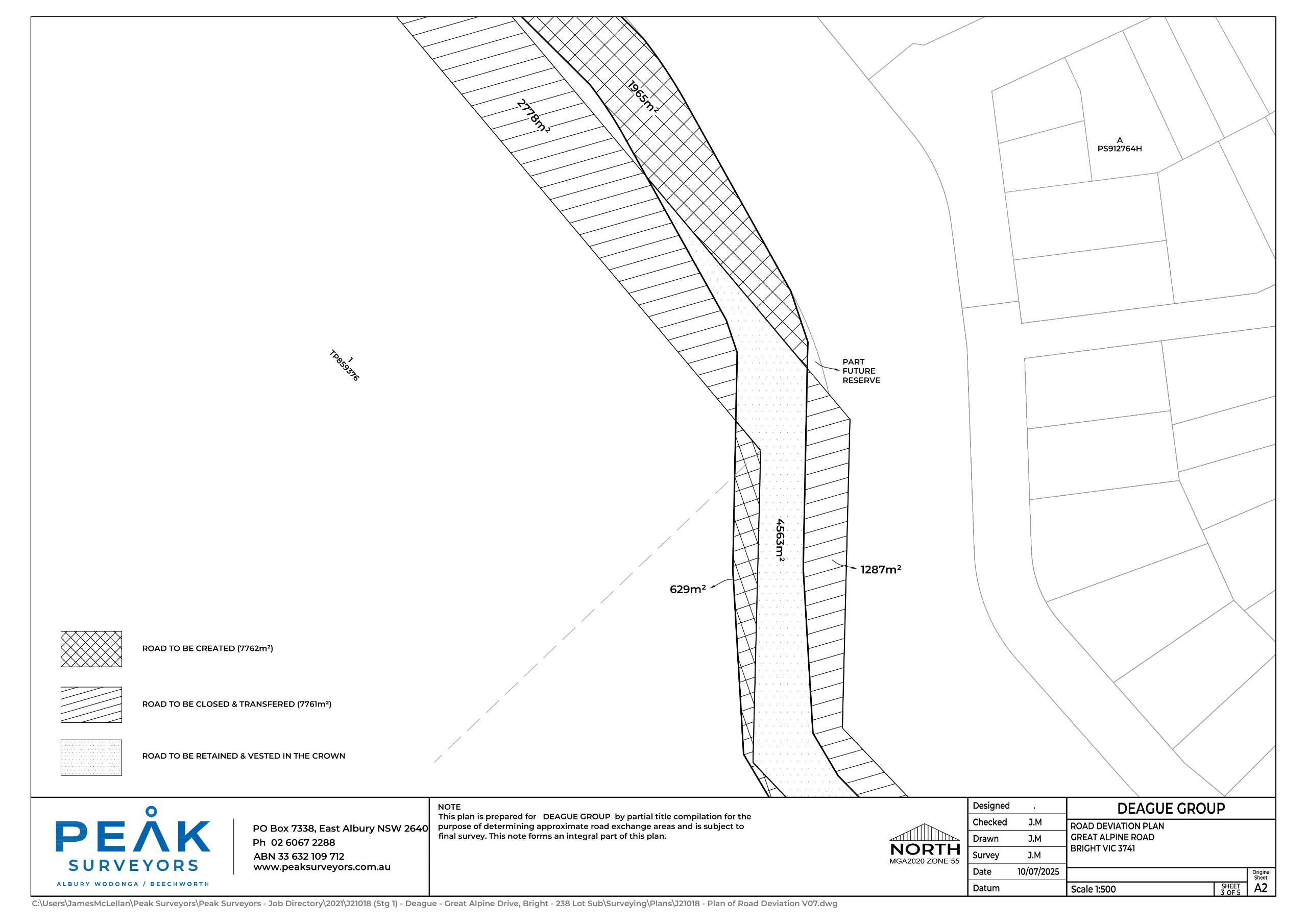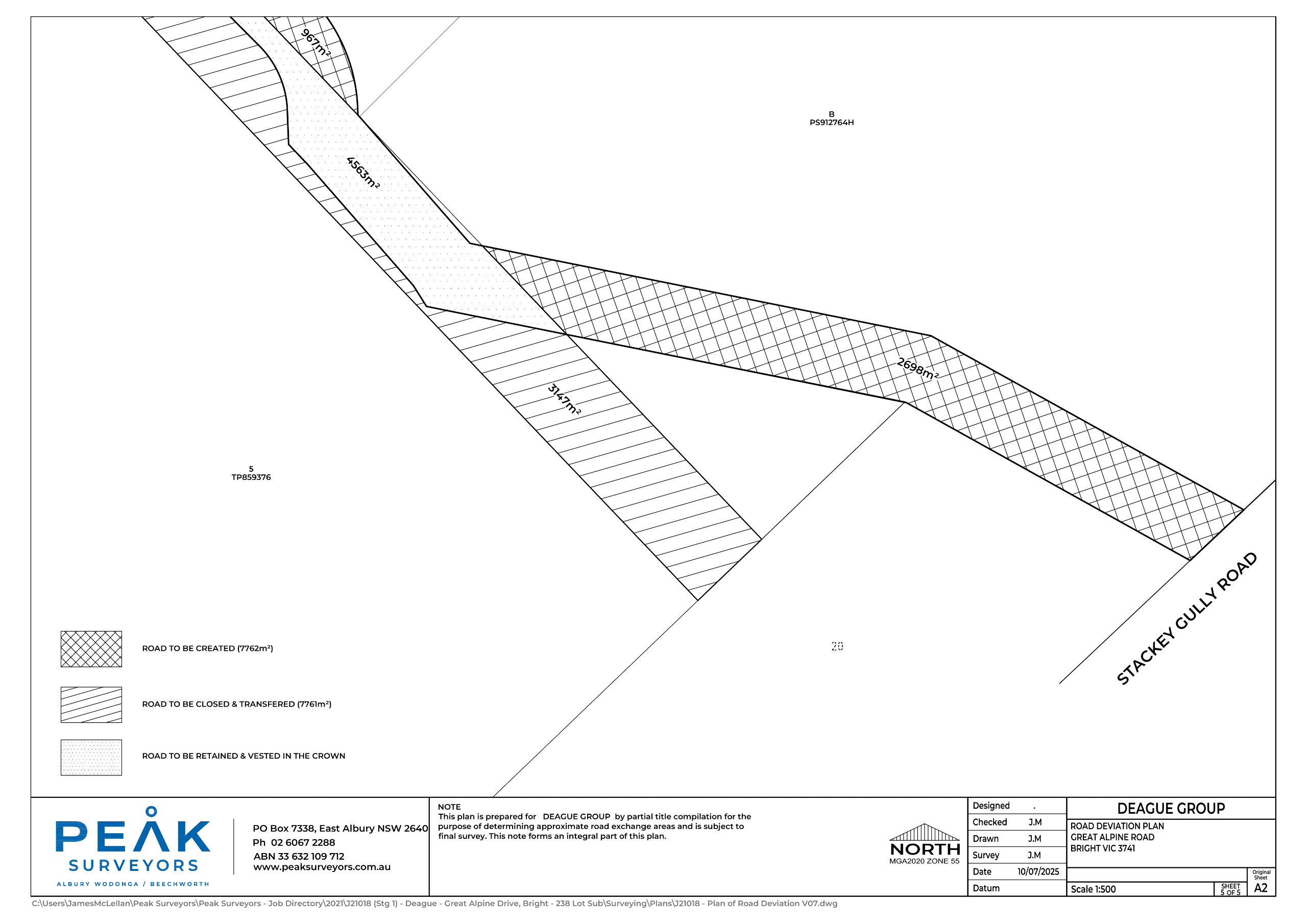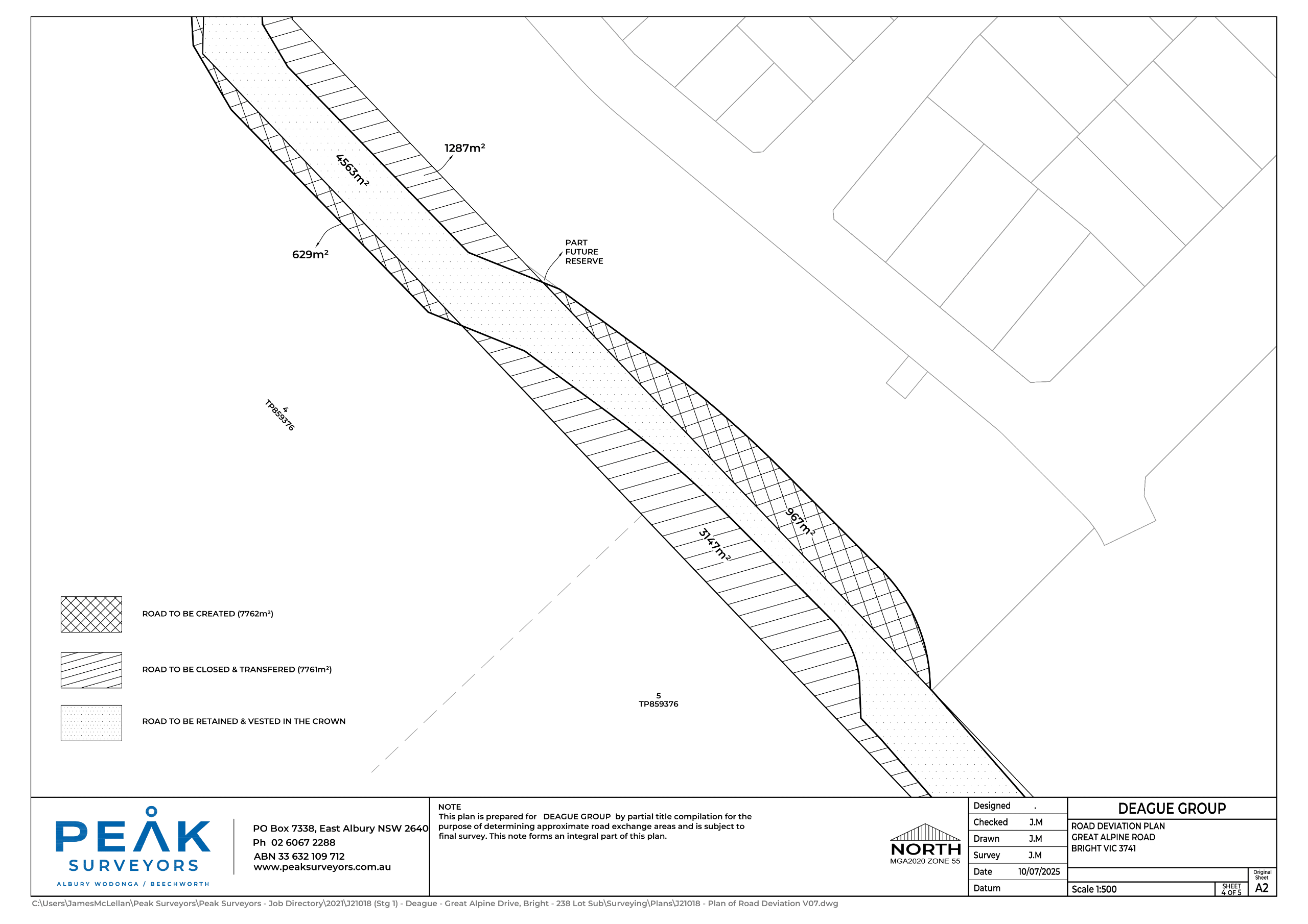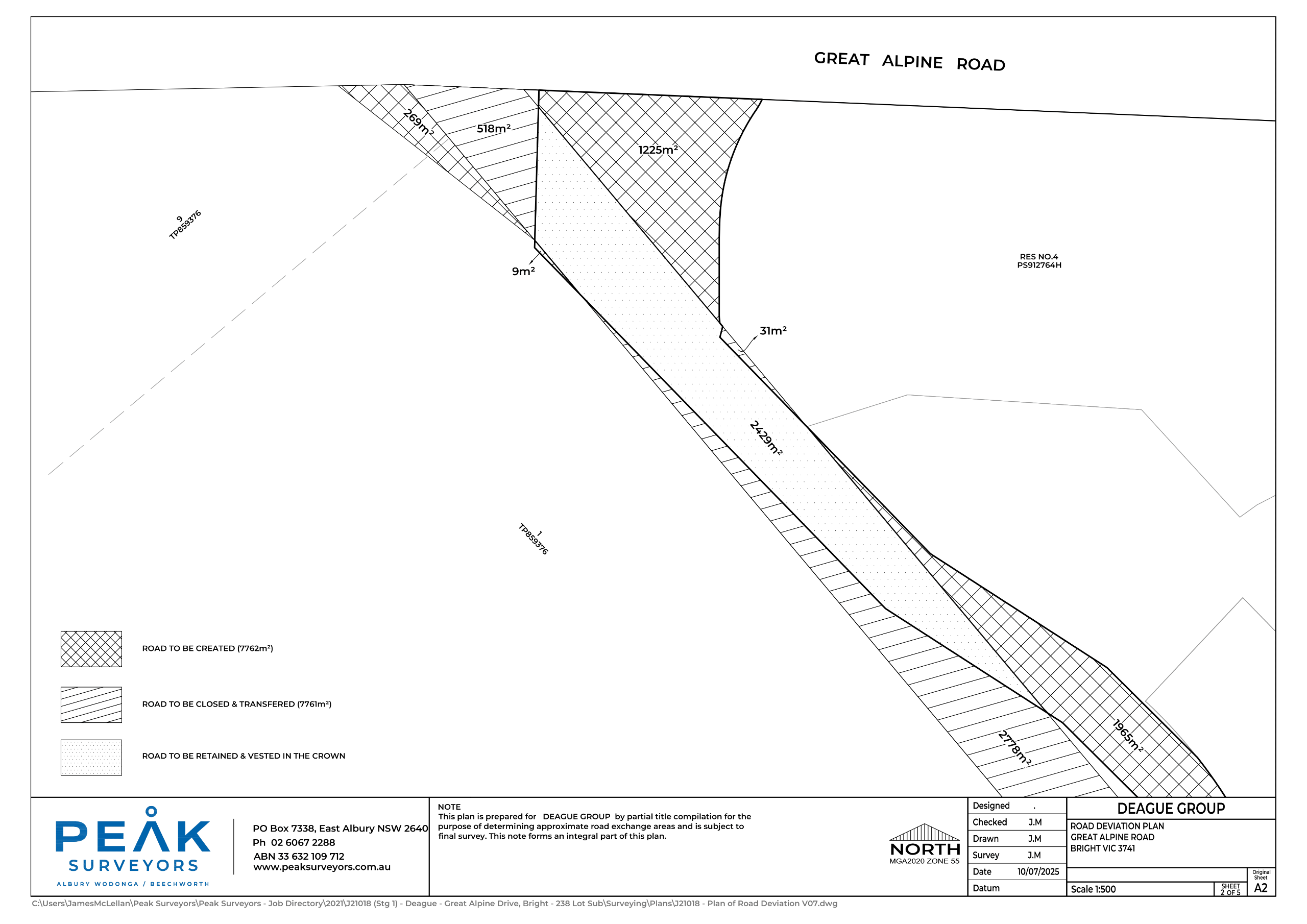 The reason for the proposed deviation is to improve the connection angle at the Great Alpine Road intersection and avoid various constraints preventing the construction of a road within the existing Road Reserve, notably the gradient at several points along the reserve.