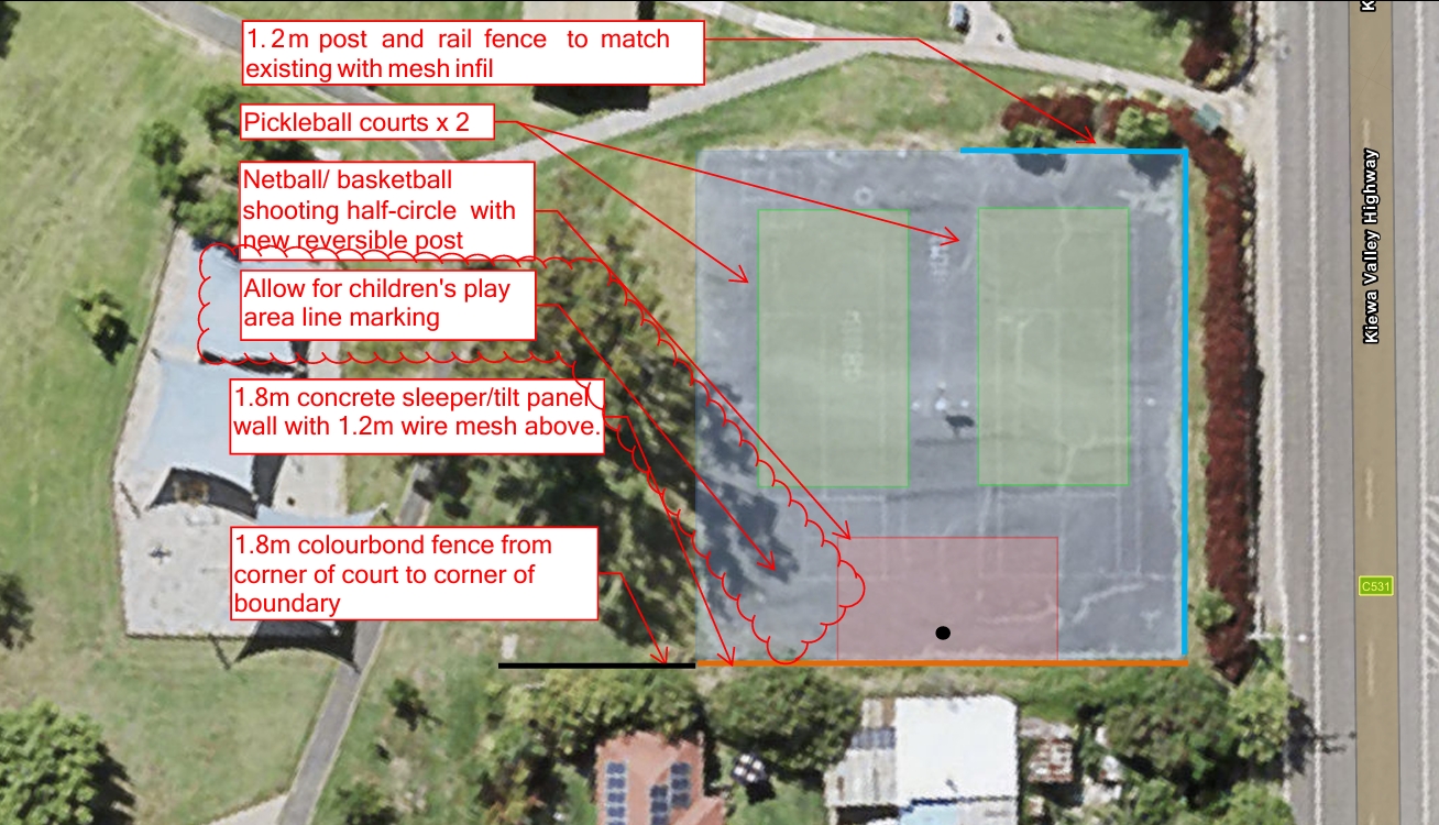The existing asphalt courts are in poor condition and no longer used for tennis. Council plans to resurface the courts with a durable acrylic surface, incorporating: